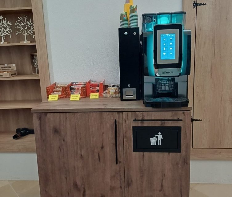 Mit seinem 7-Zoll-Touchscreen und einer Kapazität von bis zu 100 Heißgetränken am Tag ist der Kaffeevollautomat Necta Kometa bestens für diesen Aufenthaltsraum geeignet. Für stark frequentierte Pausenräume, wo es besonders schnell gehen muss, bietet sich die Instant-Variante dieses Automaten an. Auf Wunsch des Kunden wurde dieser Automat mit einer Zahlungsfunktion ausgestattet. Mehr Informationen zu dieser Kaffeemaschine der Necta-Serie finden Sie hier.